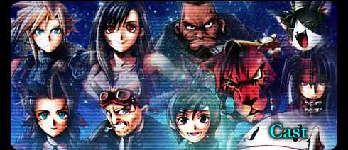 The main characters are Cloud, Tifa, Barret, Aeris, Cid, Yuffie, Red XIII, Vincent, Cait, Sephiroth, Chocobo, & Shinra.